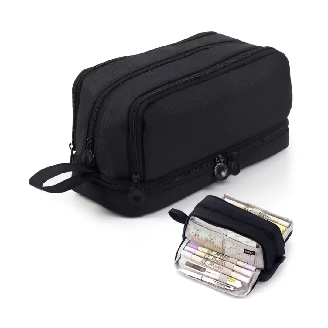 Cartuchera escolar pensada para organizar útiles de forma práctica y ordenada. Cuenta con cuatro compartimientos con cierre que permiten separar lápices, lapiceras, marcadores y otros accesorios, facilitando el acceso y manteniendo todo en su lugar. Su diseño es cómodo para el uso diario y adecuado tanto para escuela como para estudio en casa. El color negro le da un estilo clásico y versátil.